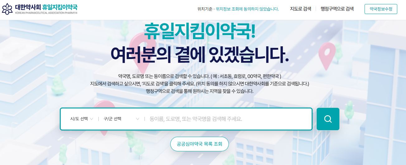 (2) 휴일지킴이 약국 서비스 이용 대한약사회에서 운영하는 ‘휴일지킴이 약국’ 서비스는 연휴에도 약국을 이용할 수 있도록 정보를 제공합니다.
